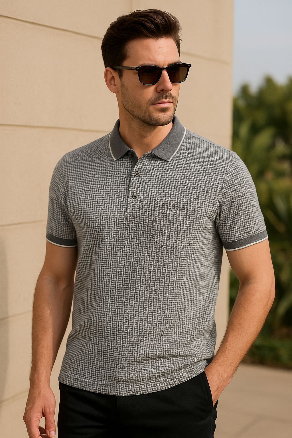 Timeless sophistication meets everyday ease in the “Classic Edge Edition” Monochrome Houndstooth Polo. Featuring an all-over houndstooth pattern in refined shades of grey and black, this polo shirt is crafted from a soft, breathable knit fabric that delivers structure and comfort. The contrasting solid collar, sleeve cuffs, and subtle chest pocket add a polished finish, while the slim tailored fit ensures a sharp silhouette.