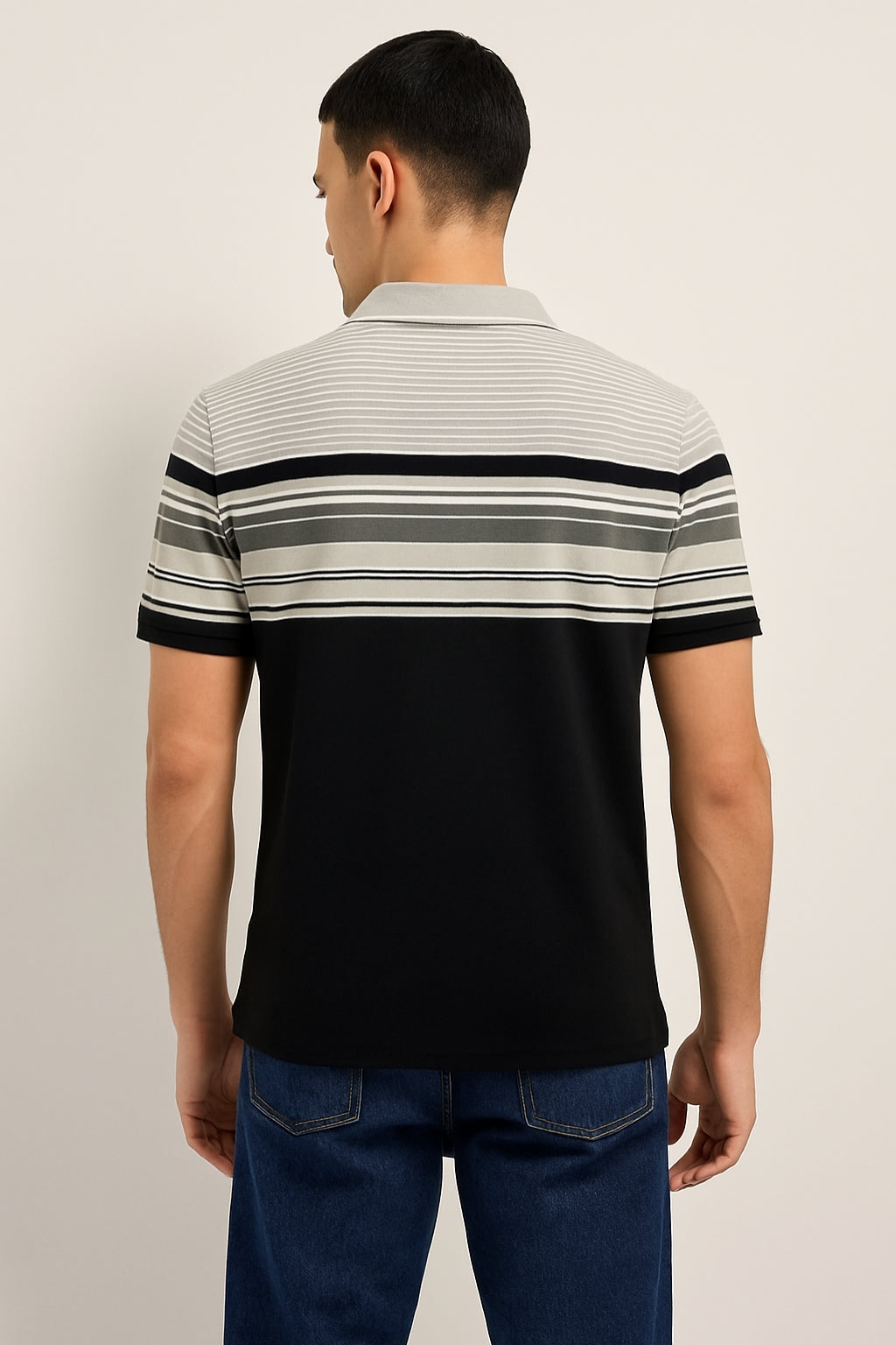 Upgrade your casual essentials with this black and grey striped polo shirt, crafted for a sharp yet laid-back appeal. The design features a light grey top panel with fine stripes, transitioning into a bold combination of grey and black horizontal stripes for a modern look. The solid black lower half balances the design, while the light grey collar and sleeve hems add a refined contrast. A chest pocket enhances practicality without compromising style. Made from a soft, breathable cotton-blend fabric, this polo is perfect for everyday wear, whether paired with jeans or chinos.