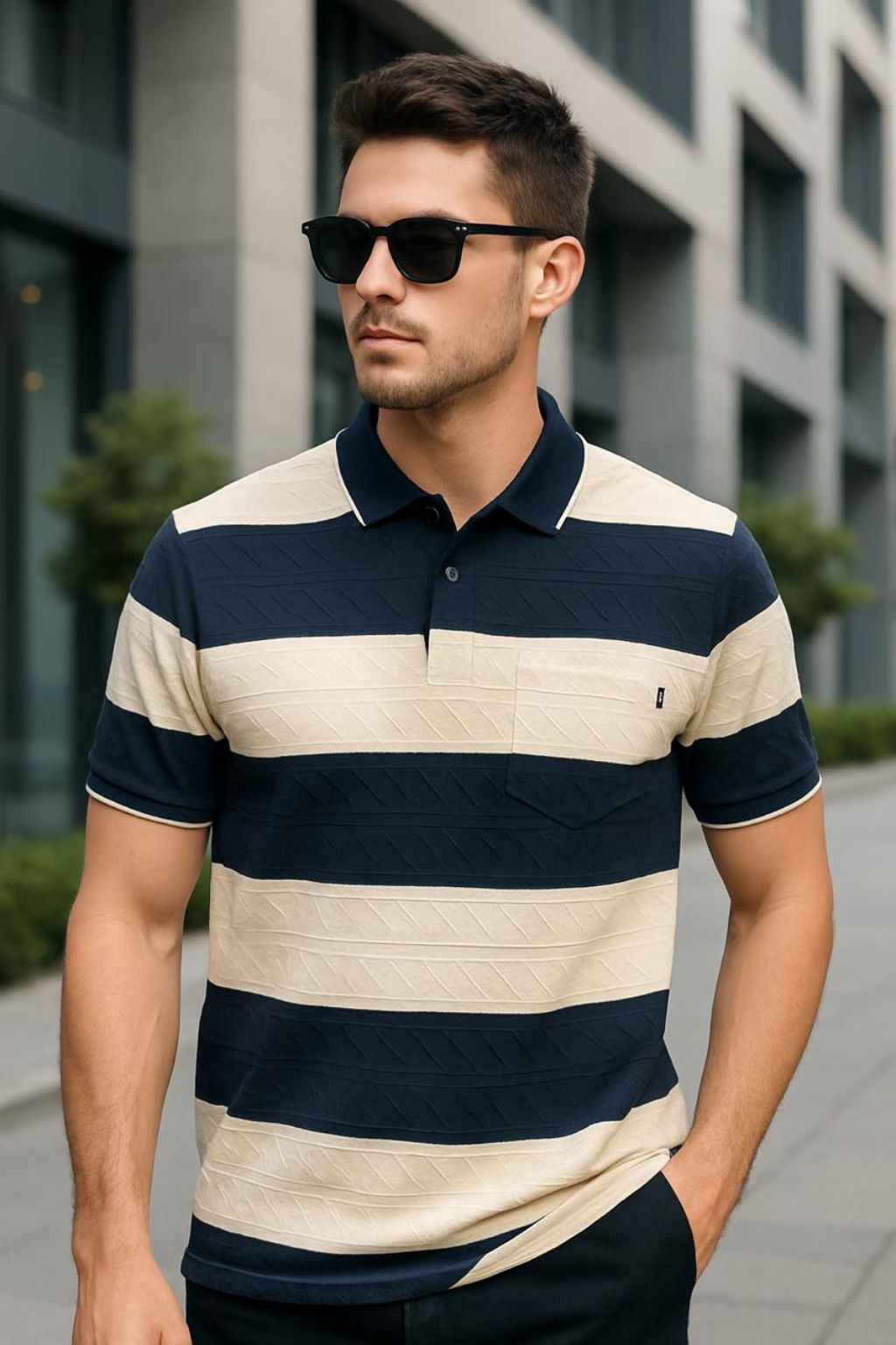 Stand out with effortless style in the “Midnight Sand Edition” Bold Stripe Textured Polo. Featuring wide alternating stripes in classic navy blue and soft beige, this polo is elevated with a subtle woven texture that adds depth and dimension to its clean design. The solid navy collar and tipping on the sleeves and placket offer a refined finish, while the front chest pocket enhances its everyday functionality.
