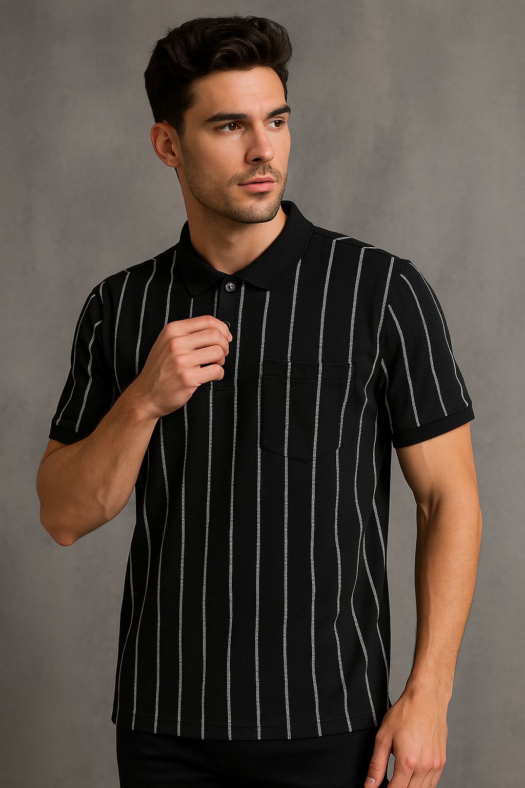 Channel timeless class with the Midnight Stripe Polo, a sleek and minimalistic masterpiece. Set on a deep black base, its vertical white pinstripes elongate the frame, offering a sharp, tailored look. The classic polo collar, ribbed sleeve cuffs, and a neatly stitched chest pocket add refined details without overpowering the clean aesthetic.