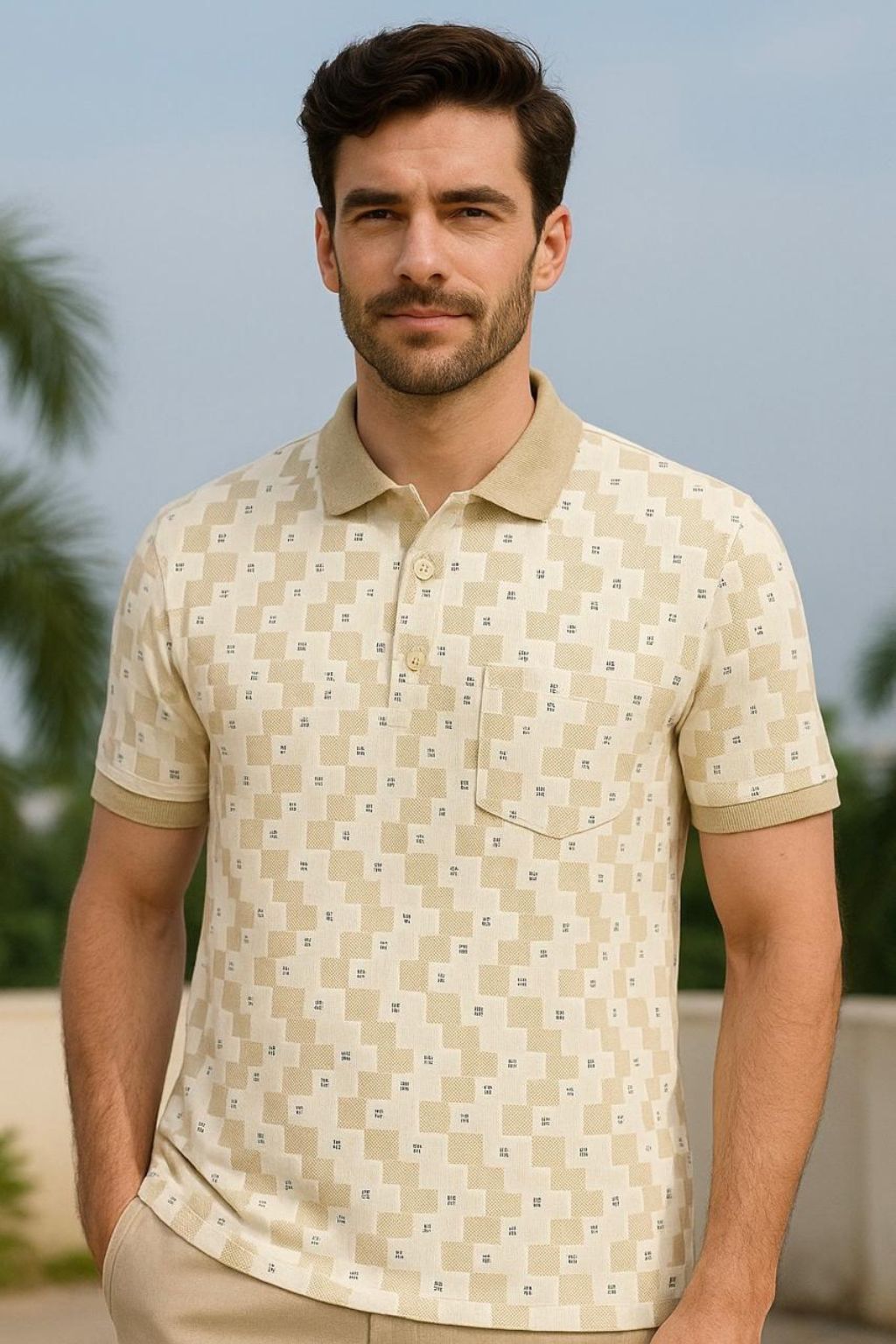 Step into subtle sophistication with the “Retro Blocks Edition” Geometric Beige Polo. Featuring an all-over pixel-block inspired pattern in soft beige and ivory tones, this polo brings a vintage-modern fusion to your casual wardrobe. Designed with a matching button placket, chest pocket, and ribbed collar and cuffs for a refined finish.