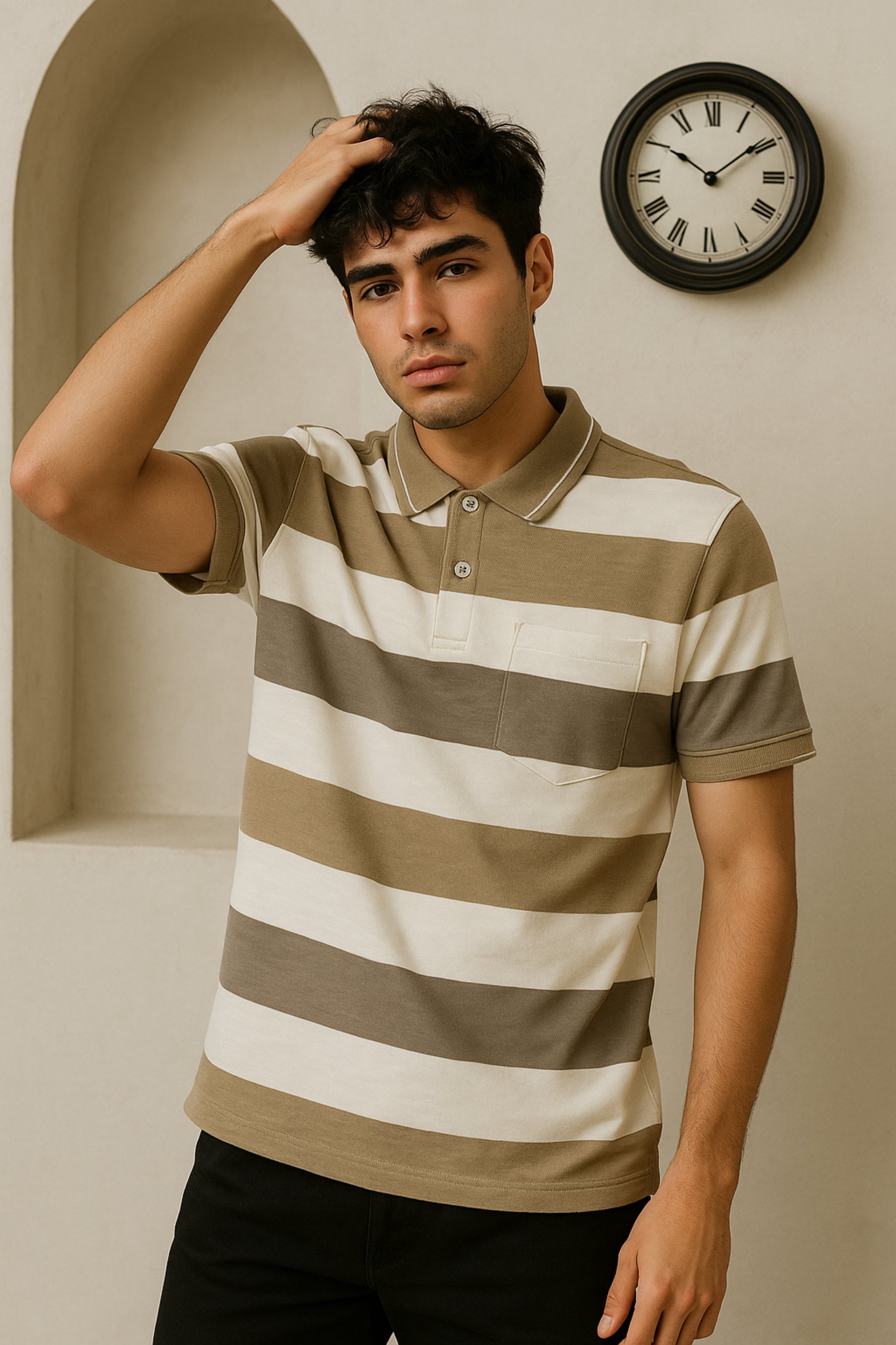 Step into effortless style with this premium striped polo T-shirt. Designed with broad beige, olive, and cream horizontal stripes, it offers a modern yet timeless appeal. The classic polo collar with button placket adds a touch of refinement, while the neatly placed chest pocket enhances functionality. Crafted from soft, breathable cotton fabric, this T-shirt ensures all-day comfort and durability. Pair it with jeans or chinos for a casual yet polished look, perfect for everyday wear or smart-casual outings.